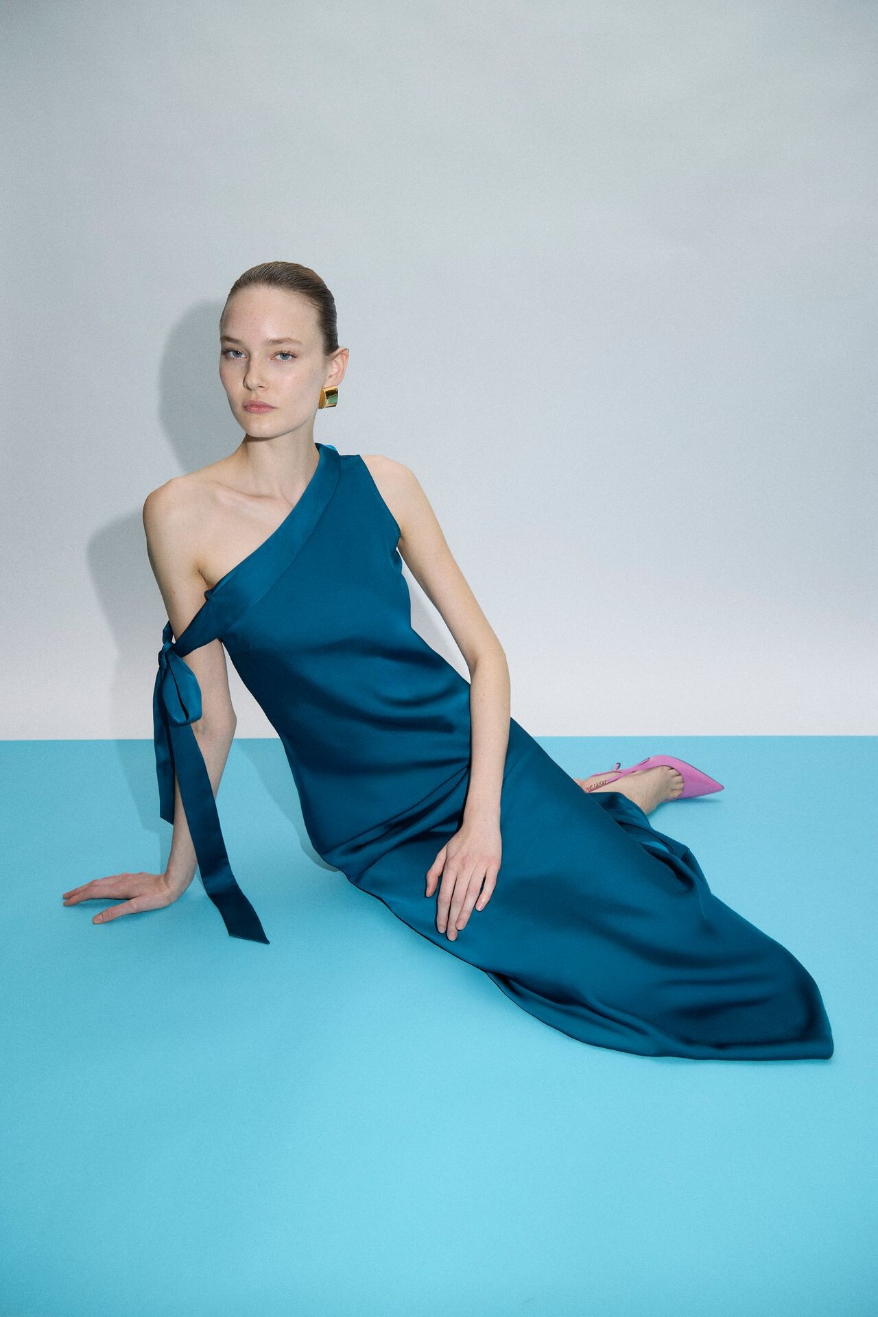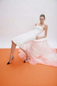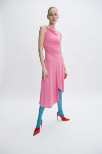 The lineup opens with pieces that immediately signal change. A black satin midi dress with a bias-cut line and a fluid cowl neckline introduces new movement into a house known for structure. Instead of a full bandage construction, a single horizontal strap across the collarbone acts as the connecting thread to the brand’s heritage. The experiment continues with an asymmetrical bubblegum-pink dress—draped, airy, and unexpectedly playful—anchored only by a ruched waist that nods to the original bandage system. Through these shifts, the collection expands its vocabulary, suggesting freedom rather than constraint, and a contemporary understanding of the Hervé woman.