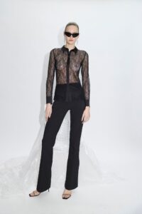 Several looks dig more directly into the house’s core codes but push them into fresher territory. Panels widen or taper unexpectedly; surfaces shift from matte to reflective; and certain dresses introduce rounded or asymmetrical hems that soften the straight, powerful lines traditionally associated with the label. Across the 18 outfits, the collection moves between controlled curve-tracing and fluid drapery, suggesting a brand learning to breathe without losing its sculptural backbone. Even the more understated pieces—lean knit separates, delicate lace sheaths, sleek jersey gowns—feel intentionally calibrated, designed to expand the brand’s reach without confusing its identity.