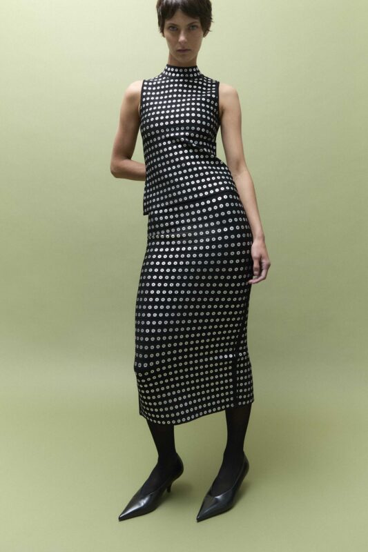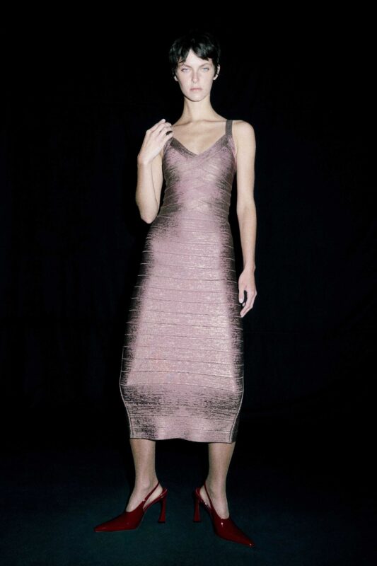 The collection introduces several novel elements, many of which draw inspiration from the Hervé Léger archives. A notable reintroduction is a basketweave technique, elegantly positioned under the bust to create a flattering aesthetic. Similarly, archival stretch lace finds new life on slimming frock designs. Innovation is also evident in a spray metallic ombré treatment, designed to mimic the brand’s distinctive bandage effect without the need for traditional layering. Furthermore, a grommet-like foiling technique on select separates offers a modern interpretation, resembling both hardware and a sophisticated polka dot. The collection also explores new material territory with the integration of leather, seen in a striking midi-length red slip, and plays with transparency through the incorporation of mesh inserts. A foray into tailoring further signals the brand’s expanding design scope, with these introductions reportedly well-received by the customer base.
