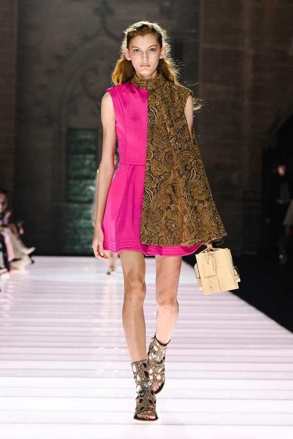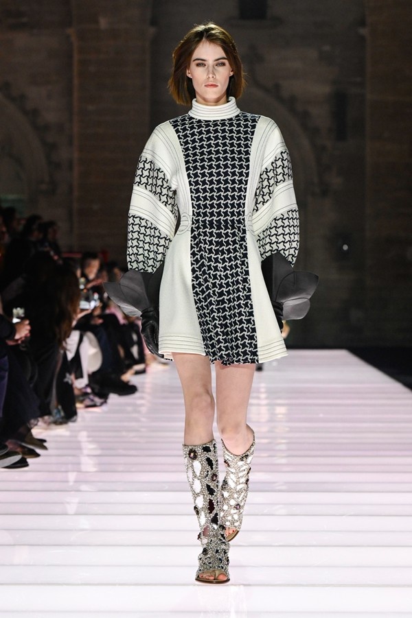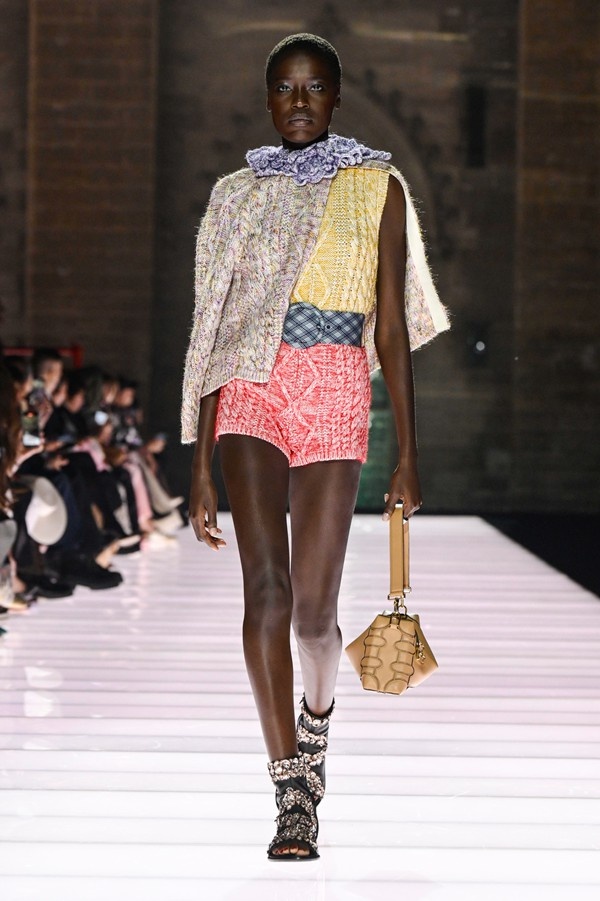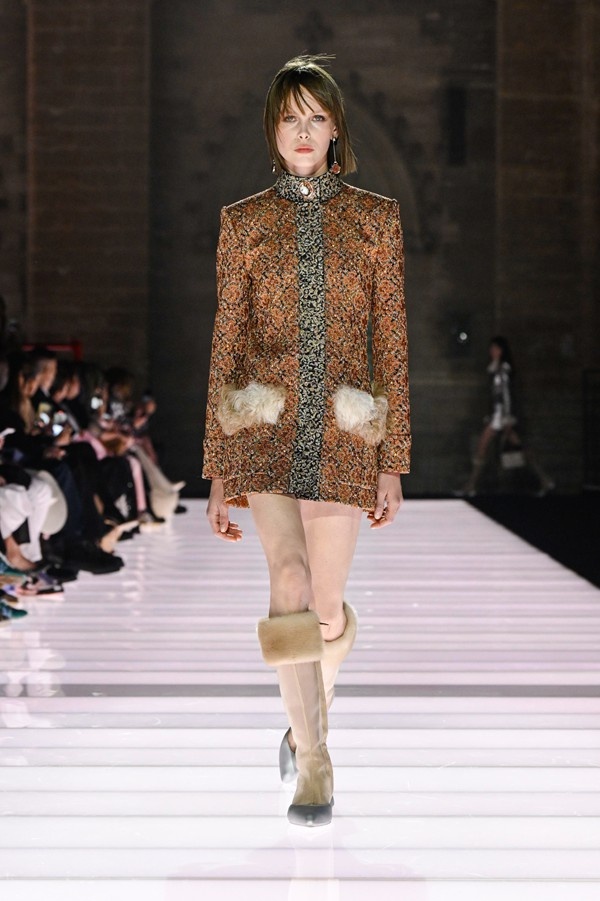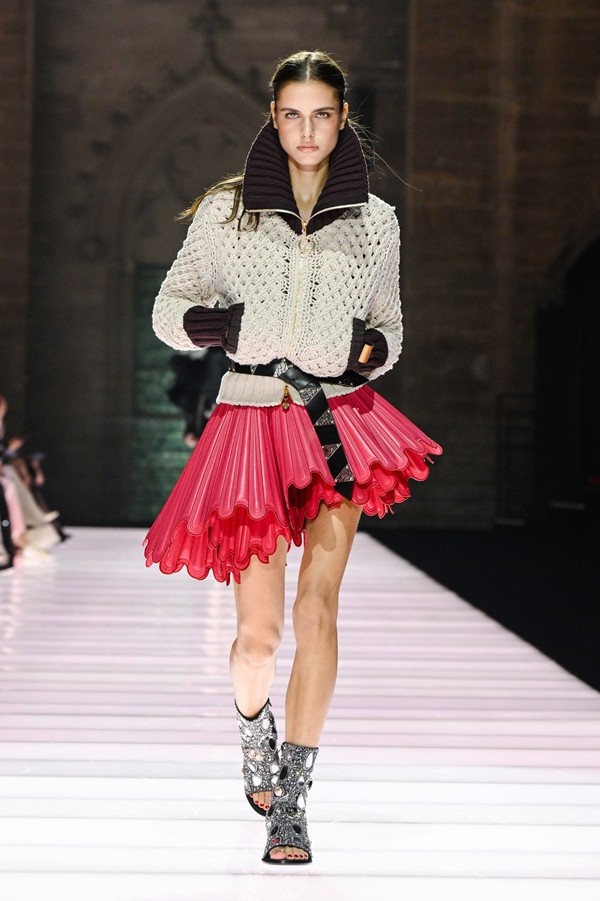 While many pieces skewed towards a dressy aesthetic, incorporating rich, often metallic fabrics and dense embroideries, the collection also included more streamlined designs such as pea coats, tailored skirt suits, and a variety of demonstrative knitwear and jersey pieces. An exploration of unusual materials and textures was evident, from raffia caps to wood-framed handbags developed in collaboration with artisan Thomas Roger. The color palettes and motifs within the collection were influenced by artworks and decorations discovered within the papal bedrooms, while silhouettes, including short, flaring skater skirts and knitted hot pants, anchored the designs firmly in the present.