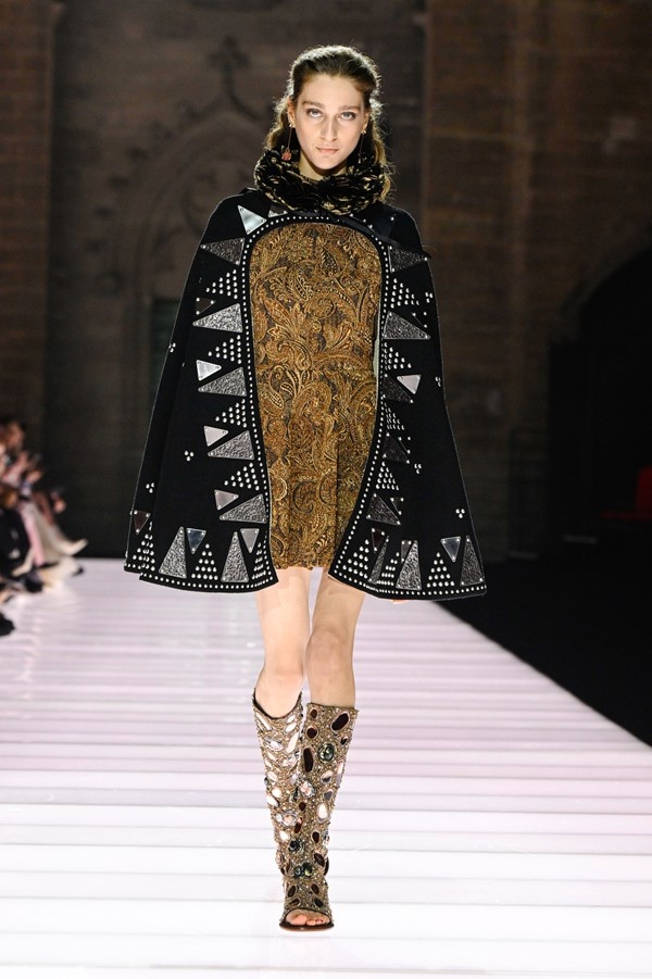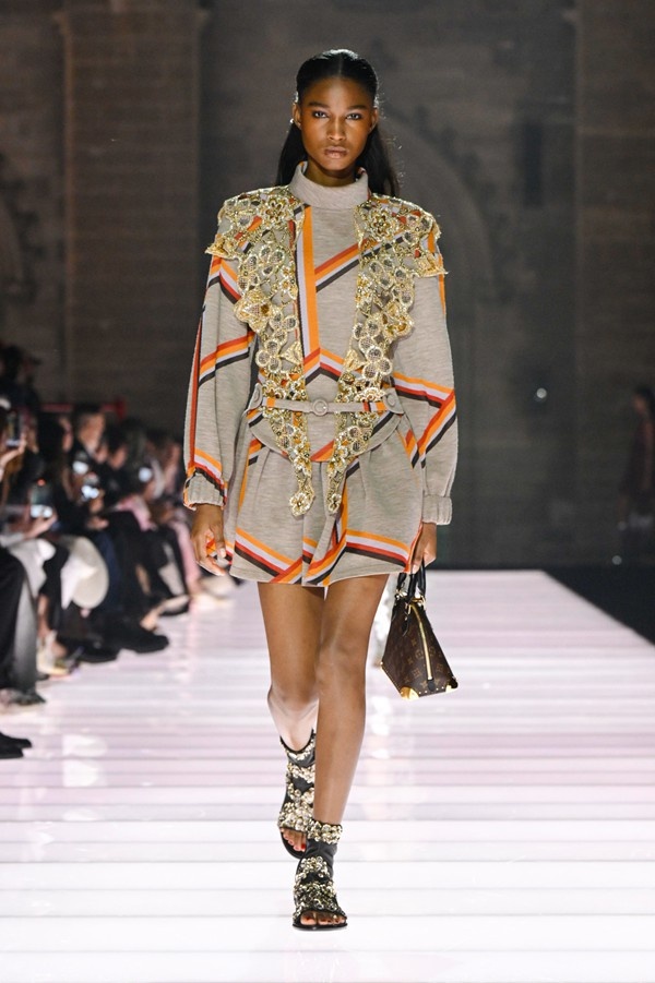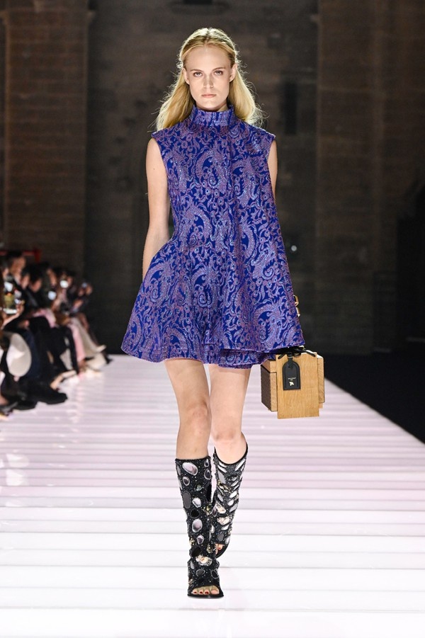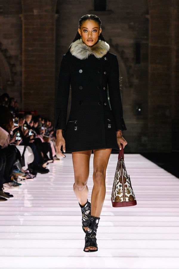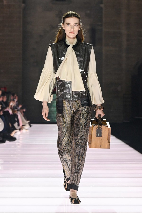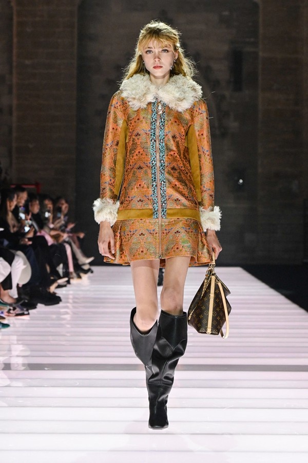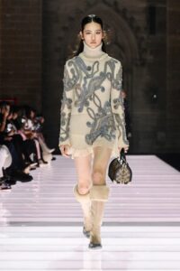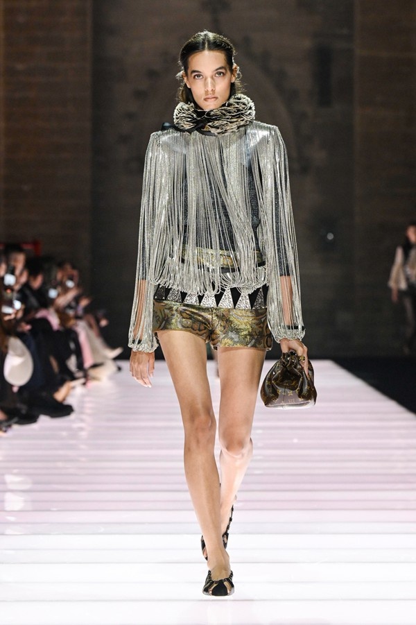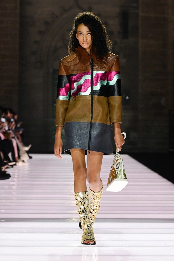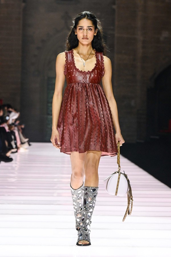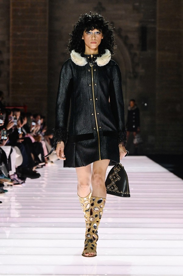 Accessories played a significant role, featuring open-toed, sock-like booties adorned with mirrors and precious materials, and leather cavalier boots embellished with numerous silvery grommets. Iconic Alma bags were reinterpreted with gilded 3D embellishments, a technique reminiscent of manuscript illumination found on rare book covers. The collection’s references spanned a broad historical and cultural spectrum, from Arthurian legends to glam-rock aesthetics, reflecting a deliberate engagement with history while maintaining a contemporary sensibility.