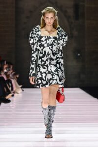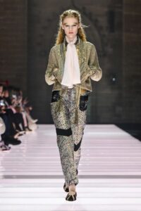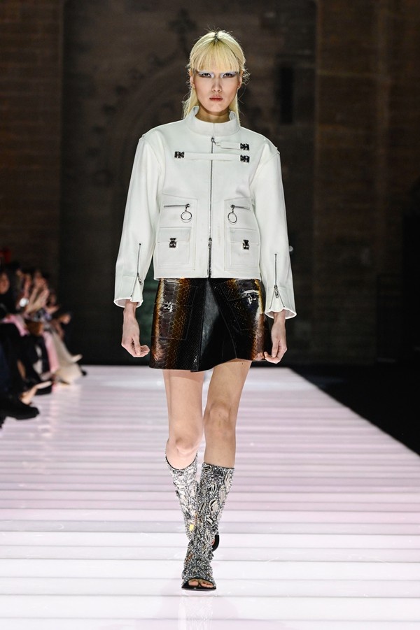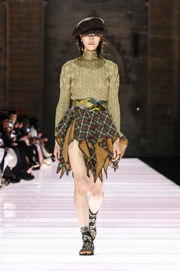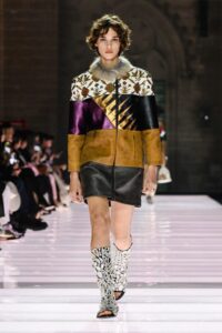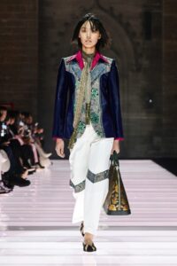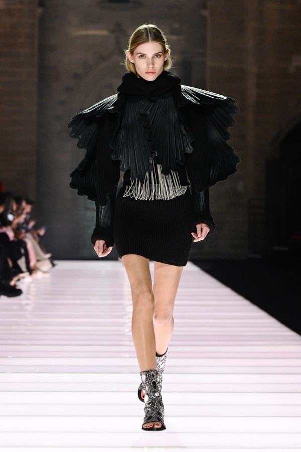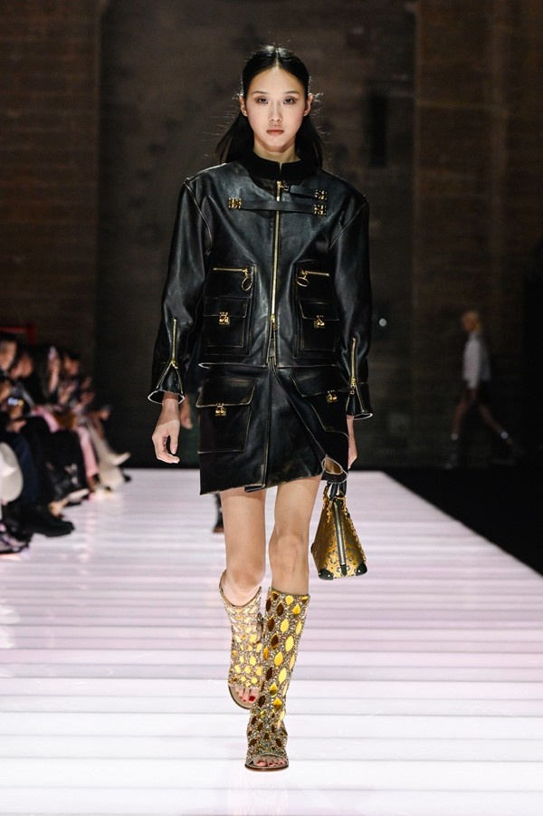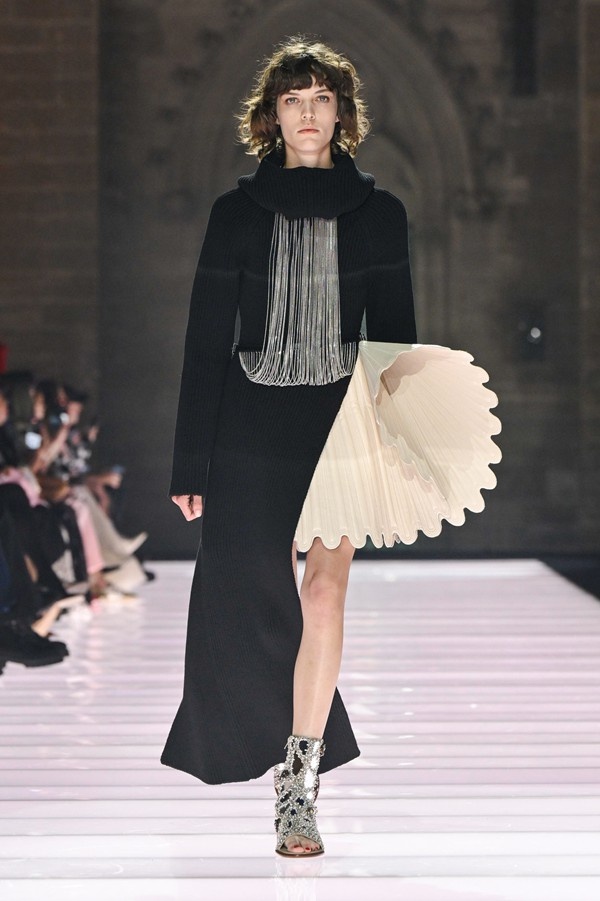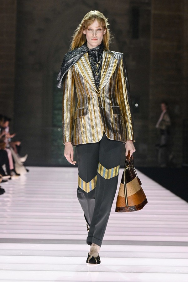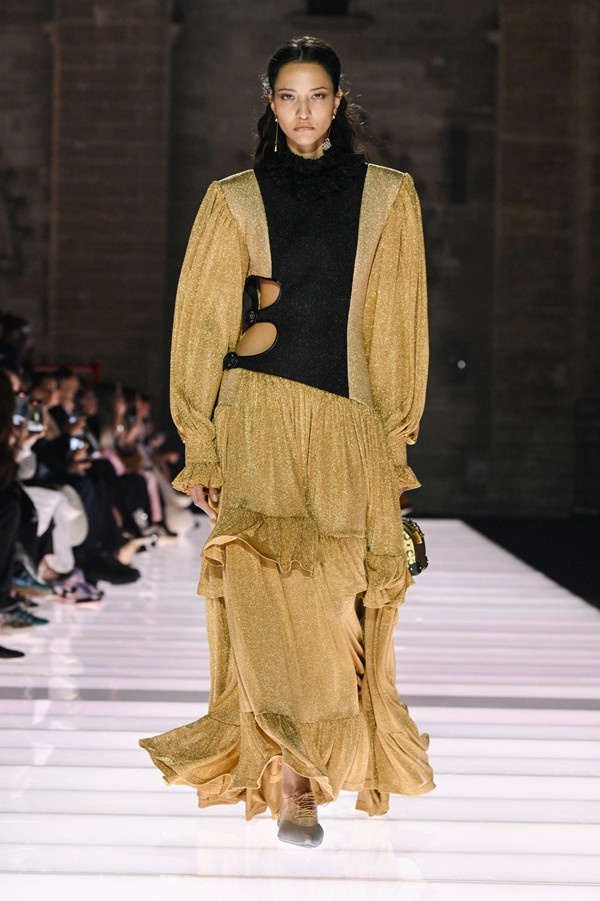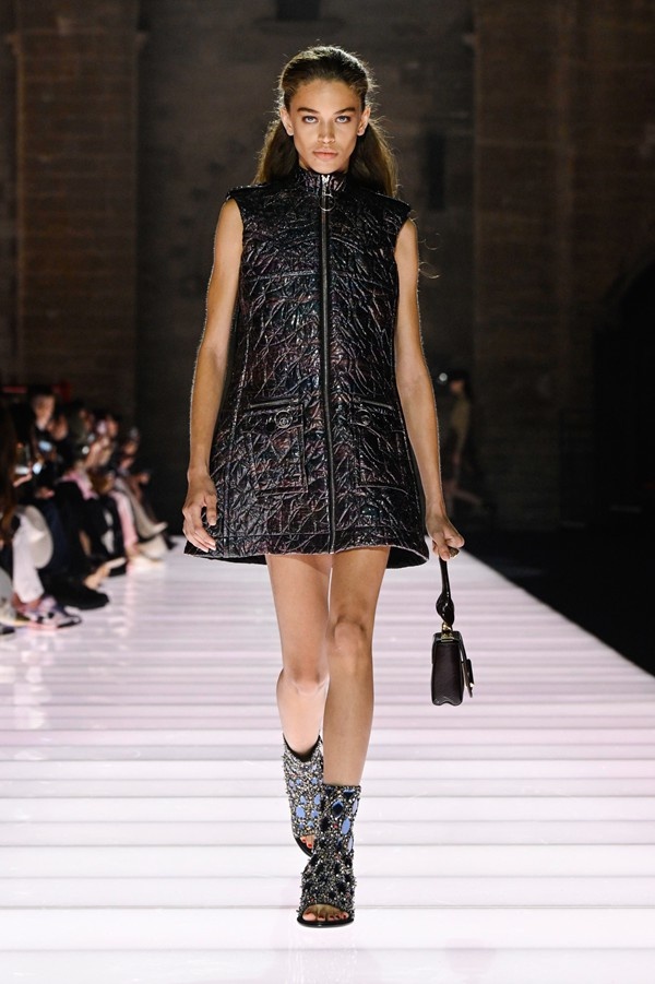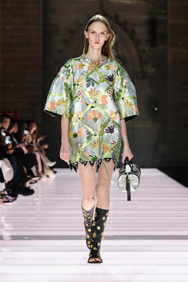 Accessories played a significant role, featuring open-toed, sock-like booties adorned with mirrors and precious materials, and leather cavalier boots embellished with numerous silvery grommets. Iconic Alma bags were reinterpreted with gilded 3D embellishments, a technique reminiscent of manuscript illumination found on rare book covers. The collection’s references spanned a broad historical and cultural spectrum, from Arthurian legends to glam-rock aesthetics, reflecting a deliberate engagement with history while maintaining a contemporary sensibility.